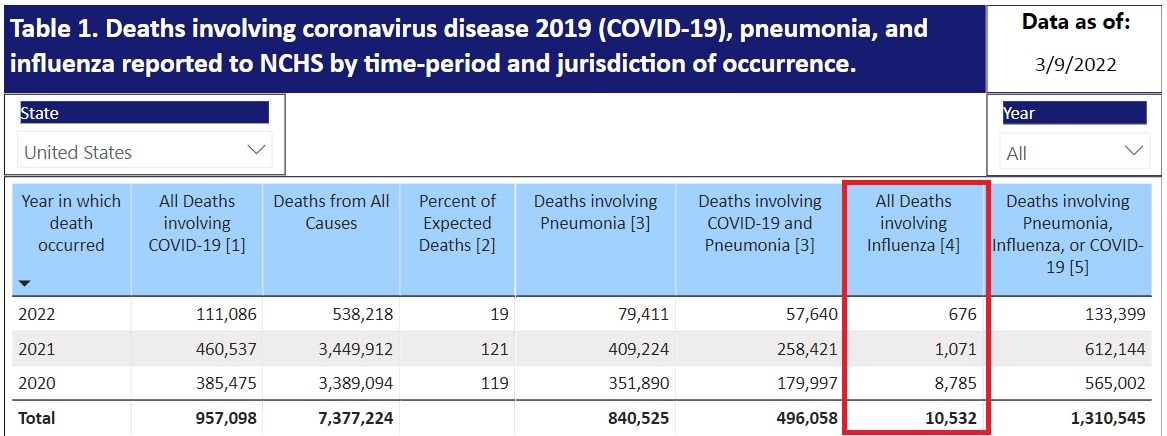 Here is what the CDC’s official statistics are reporting for annual flu deaths since 2020, as of today, March 9, 2022: