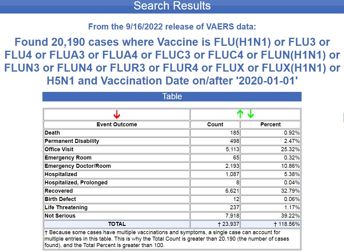 Since 2020 through the most current statistics added to the VAERS database last Friday, September 23, 2022, there have been 20,190 cases of flu vaccine injuries filed, including 185 deaths, 498 permanent disabilities, 237 life threatening events, 2255 visits to the ER, and 1095 hospitalizations. (Source.)