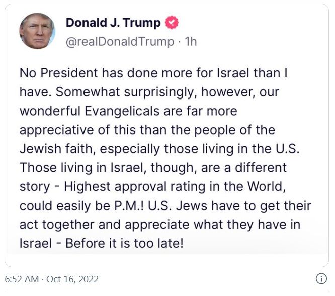 And while he claims he is so popular in Israel, he acknowledged that Evangelical Christians are “far more appreciative” for what he has done for Israel, than “people of the Jewish faith” living in the U.S.