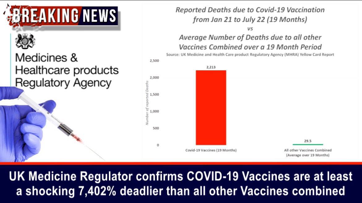 The UK Medicine Regulator has confirmed that over a period of nineteen months the Covid-19 Vaccines have caused at least 5.5x as many deaths as all other available vaccines combined in the past 21 years.