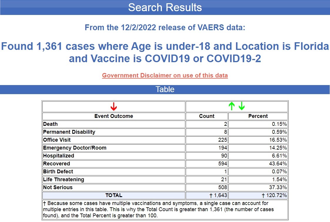 The U.S. Government Vaccine Adverse Events Reporting System (VAERS) currently shows 1,361 children in Florida injured following the shots, including 2 deaths, 8 permanent disabilities, 194 ER visits, 90 hospitalizations, and 21 life threatening events. (Source.)