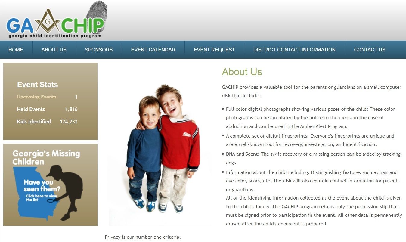 According to Wikipedia, North American Masonic lodges have created the Masonic Child Identification Programs (CHIP) as a charitable endeavor to help locate and identify missing children. The Grand Lodge provides financial assistance for CHIP programs, which are run by volunteers from lower-level lodges and are manned by law enforcement and dentistry professionals.