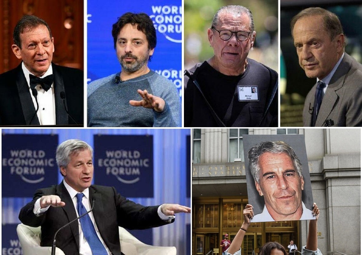 Top row: Thomas Pritzker, executive chairman of Hyatt Hotels, Sergy Brin, co-founder of Google, Michael Ovitz, venture capitalist and co-founder of the Creative Artists Agency, Mort Zuckerman, a real-estate billionaire who owns US News & World Report. Bottom row: Jamie Dimon, JPMorgan Chase CEO, picture of Jeffrey Epstein.
