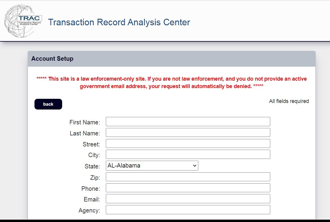 He insisted TRAC has not provided data to the defense industry or intelligence agencies. While the TRAC website is publicly available, it does warn that only law enforcement officials with a valid government email can sign up for access.
