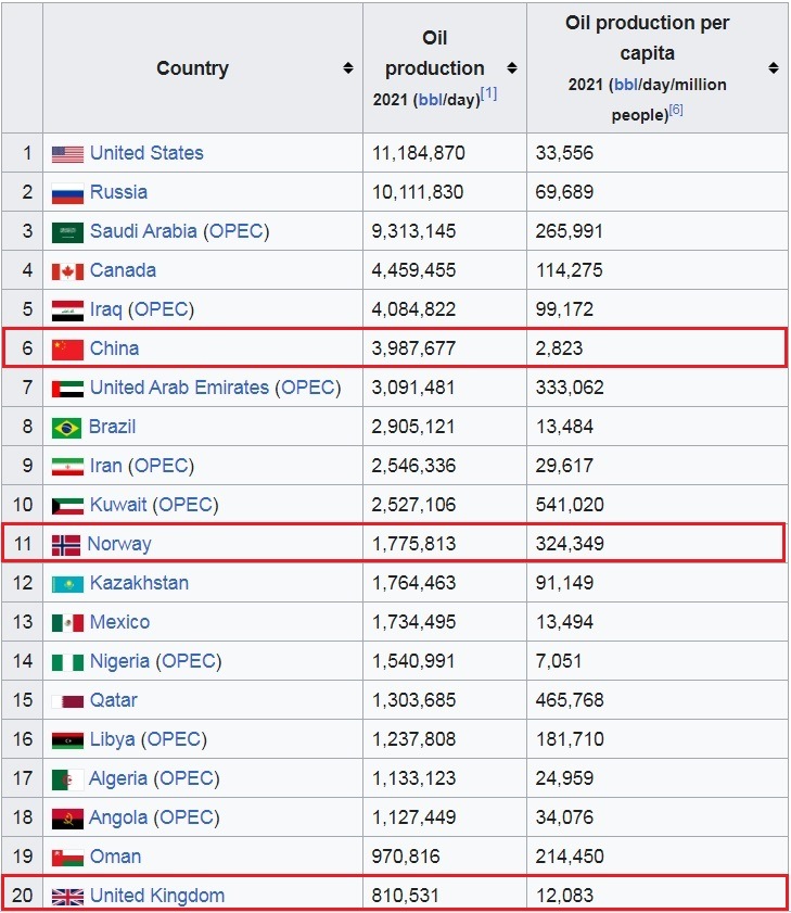 As you can see from the chart above from Wikipedia listing the top 20 oil-producing countries in the world, Europe only has 2 of those nations, Norway at #11 and the United Kingdom at #20.