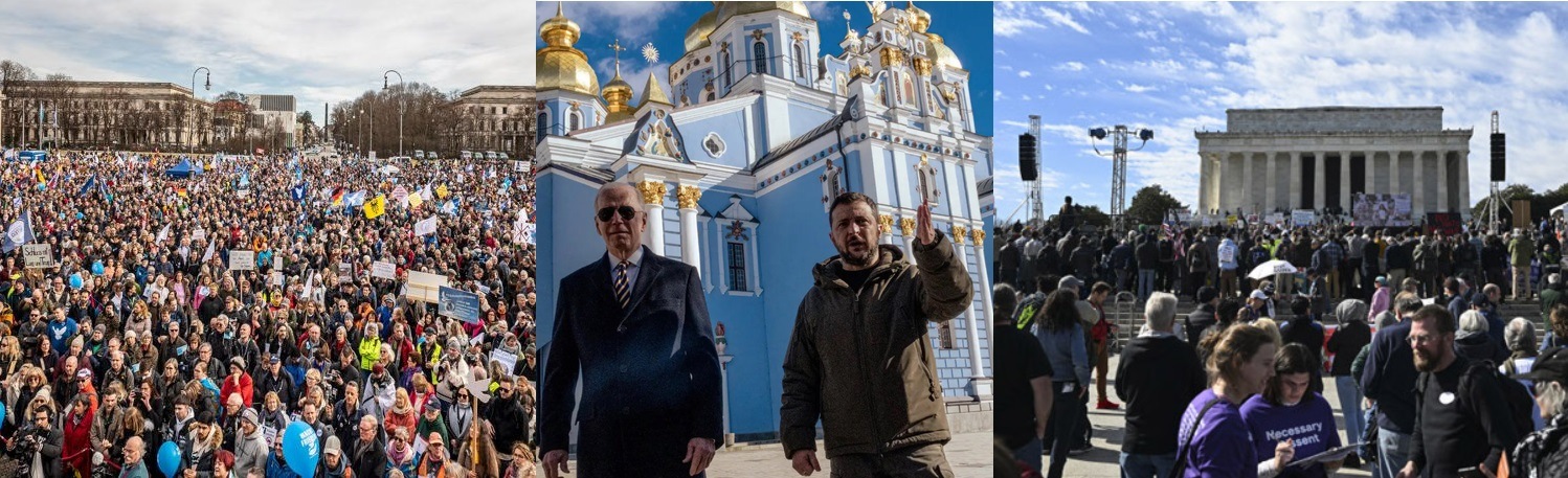 Left: 20,000 Protesters March for Peace in Munich to Protest Kamala Harris’s presence and the Ukraine War – Center: President Biden with Ukraine President – Right: Protesters in Washington D.C. at the “Rage Against The War Machine” Protest.