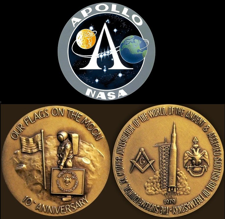 One of the original Apollo logos above. Below are the two sides of a 10-year anniversary commemoration coin for the first “Moon Landing” that was put out by Freemasons.