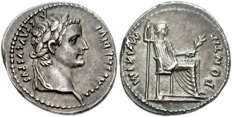A denarius featuring Tiberius. The inscription on the obverse reads Ti[berivs] Caesar Divi Avg[vsti] F[ilivs] Avgvstvs (“Caesar Augustus Tiberius, son of the Divine Augustus”), and the reverse reads Pontif[ex] Maxim[us] (“Highest Priest”). Source.