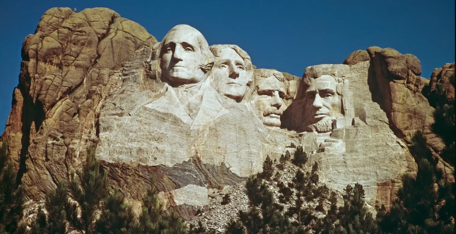 Mount Rushmore, which was completed in 1941, features the immense faces of former Presidents George Washington, Thomas Jefferson, Abraham Lincoln and Teddy Roosevelt carved into the granite mountainside