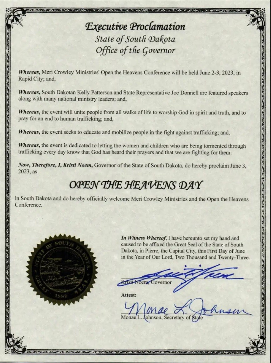 South Dakota Governor Kristi Noem apparently agrees with all this, as she signed an executive proclamation on June 3, 2023 as “Open the Heavens Day.”