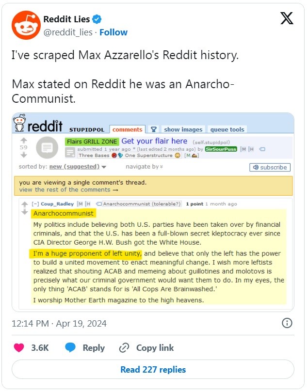 Azzarello was reportedly active in the Anarcho-Communist forum on Reddit,